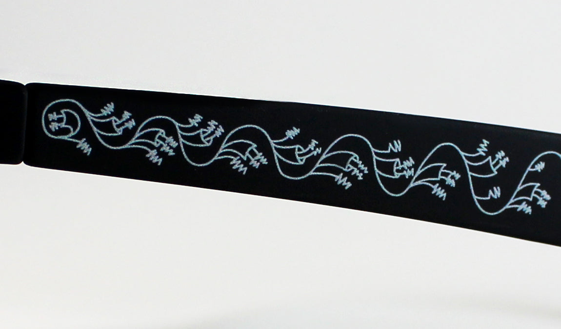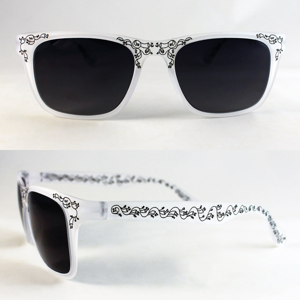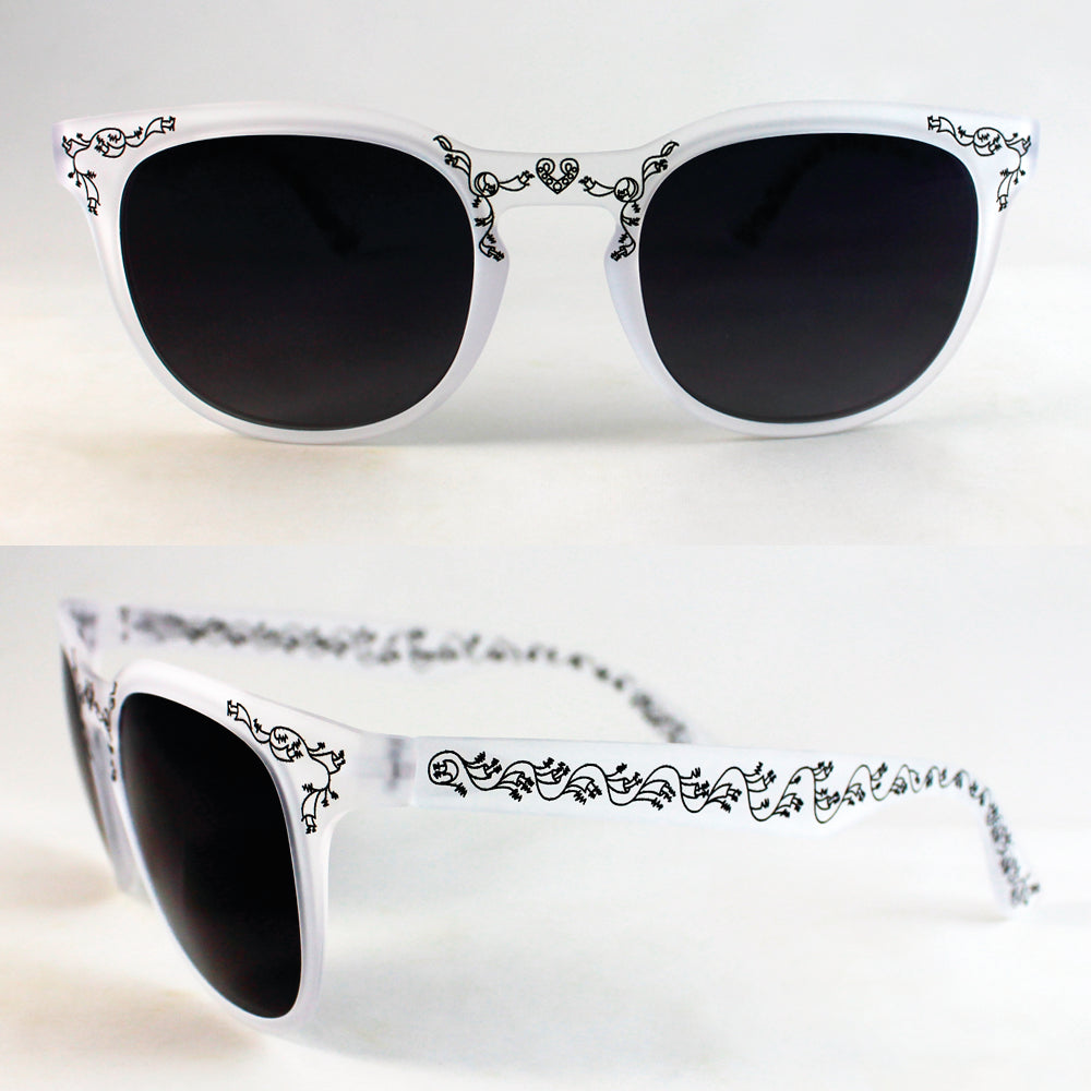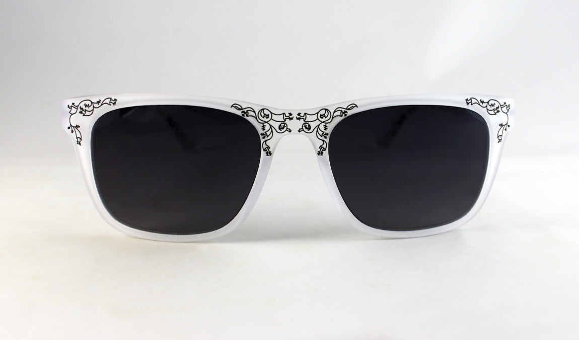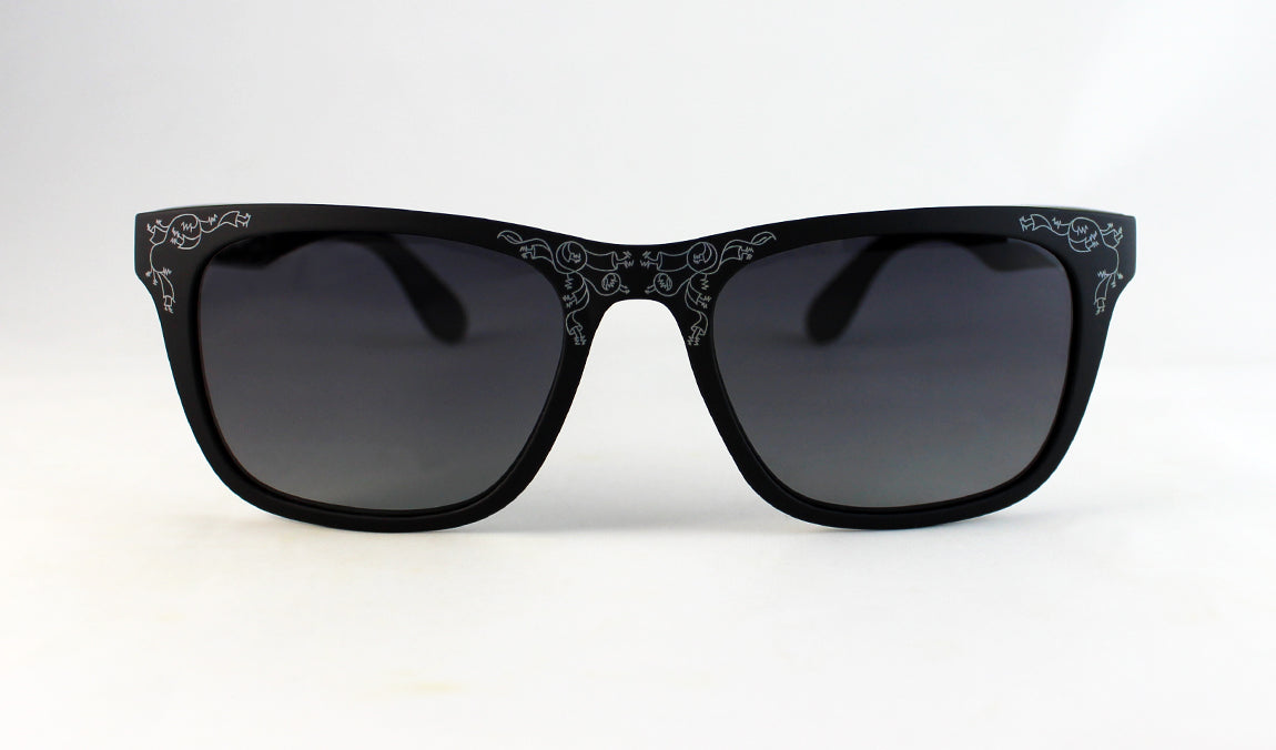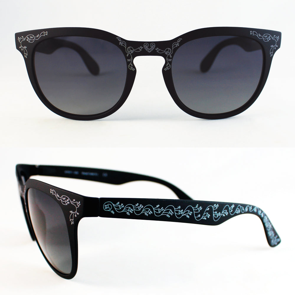 - Gafas con montura negra y dibujo en color blanco. Lente espejo azul polarizada.